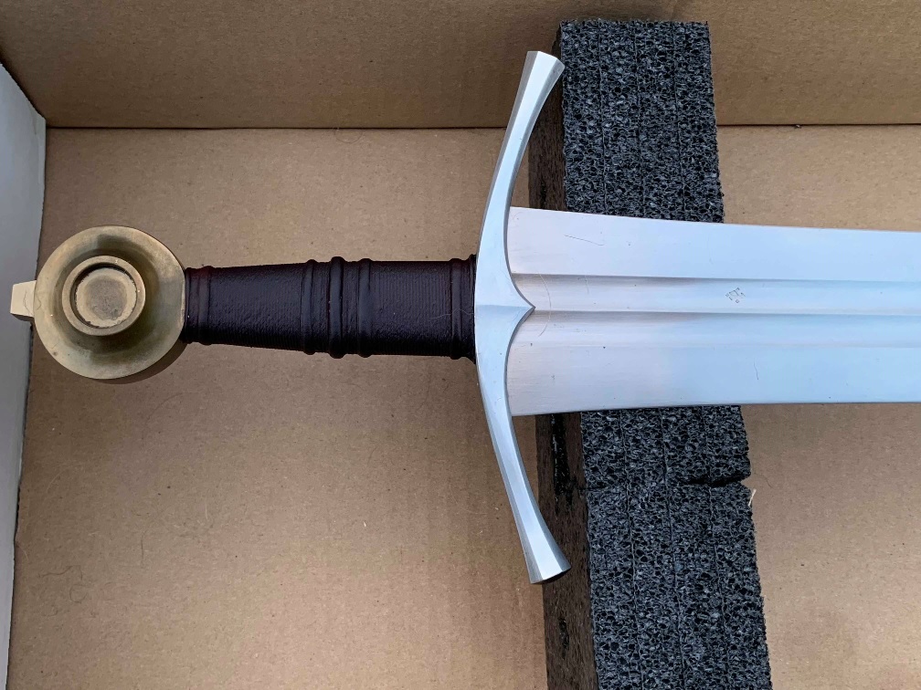 Sovereign with bronze pommel and "red" grip leather. As other Albion customers can attest to, the company tends to produce leather colors that come out a full shade darker than what's ordered - so their "red" looks more like oxblood, "light brown" just looks brown, and both "dark brown" and "oxblood" are nearly black. At least, this was the case when I bought this sword - it may have changed now. In any case, the color ordered was indeed "red," but I would say it's closer to what most people think of as "oxblood" in reality.