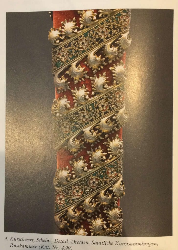 Re: the enamel: as far as I am aware silverwire cloisonné was employed at the beginning of the 15th century to decorate the so-called Kurschwert's scabbard (and pommel?) now in Dresden. Cf. attachment.