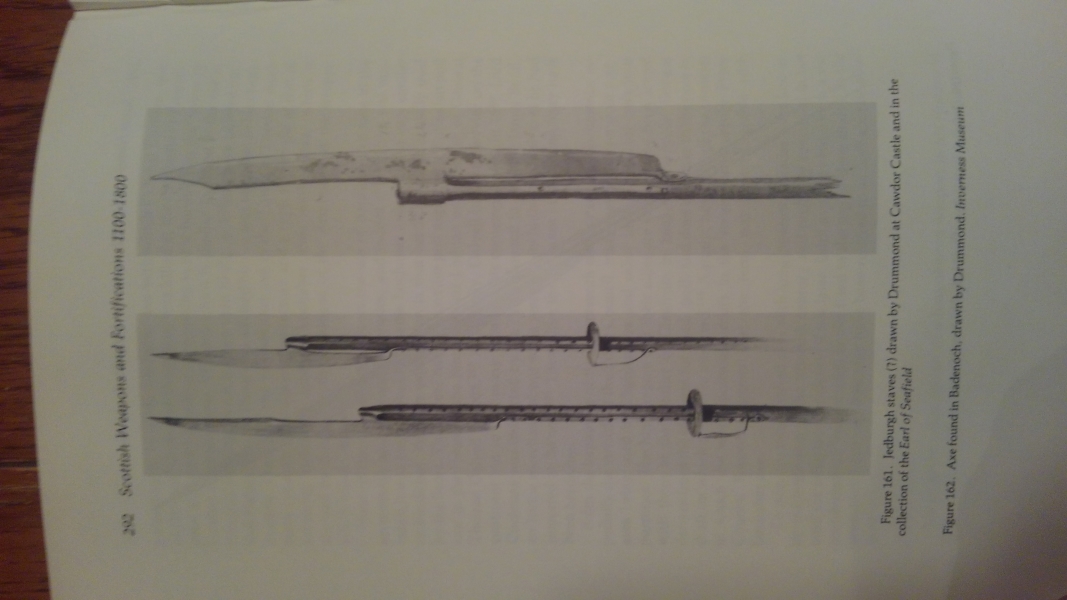 The chapter continues and makes a possible connection with the Lochaber axe form. Caldwell seems to associate the two as a similar type because of the haft attachment: wrapped around the haft like a European bardiche. I'll try to photo the plates from the book. There is also some information about Jeddart axes in two other books, but scanty.