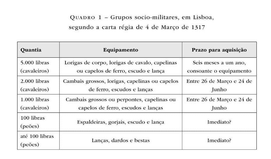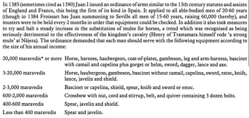 In Portugal, though, where I have some research, there was a royal decree issued by king João I over a dispute of Aquantiados burghers, of which the King decreed that any crossbowmen who had the equipment of a men-at-arms could jump into the category of men-at-arms himself. There aren't many systematical sources on that subject, but I think Portuguese military ranks would be organizated as the foot soldier (having the minimum of a spear and a sling), the crossbowmen or besteiros do Conto (from mid-classed subjects, usually artisans and guildsmen), cavalry crossbowmen and then man-at-arms. There are few references for Cavalry Crossbowmen and probably they would just be called as "crossbowmen" (João's decree seens to be directed at these).