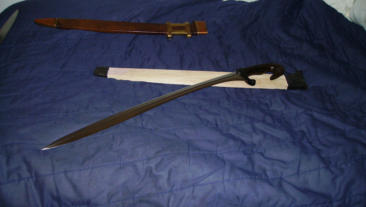 Scabbard: Scabbard is nice, wood core wrapped with water buffalo hide. Historically correct? Probably not. Still, it’s a nice scabbard.
