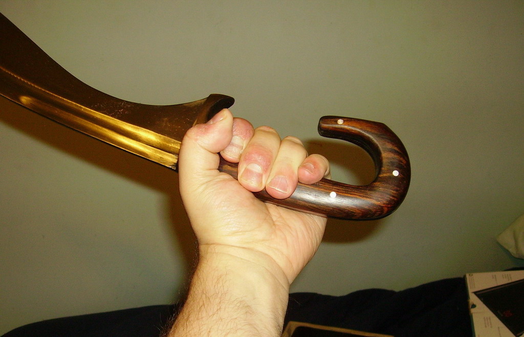 To sum it all up, I think there’s more right here than wrong. Is it perfect? Of course not, but it’s decently accurate, considering the price range. I mentioned the huge grip to the maker, and he will change the grip design in future versions (the guy is responsive to positive criticism, which is always a good thing). Just remember if you want a falcata, ask the maker to add a sharpened back edge.