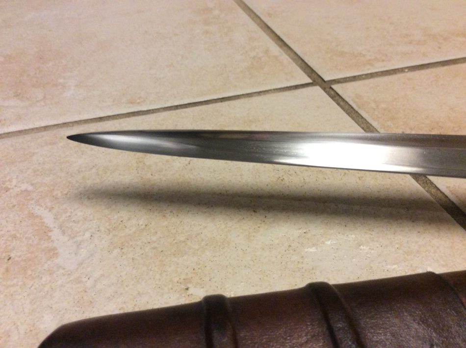 Here's a chance to get one of these with the profile reshaped to be more realistic. This was done with angle grinder, file, and sandpaper, using water to keep the blade cool as I worked. The edges will need some thinning if you intend to sharpen it. The point area is already slightly sharp as the edges there have already been formed.