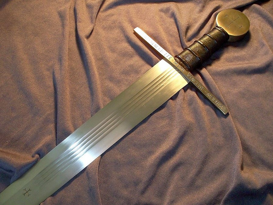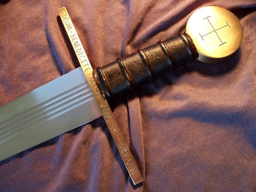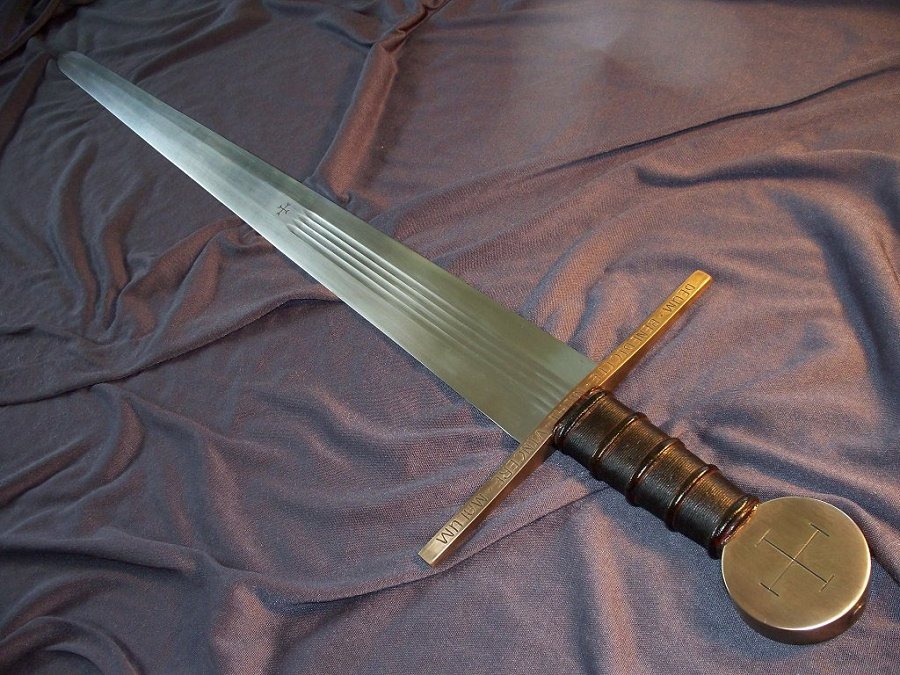 For sale to fund more stuff, a Yeshua Moonbrand Crusader, refinished Atrim Moonbrand blade, with custom engraving, custom bronze fittings by Yeshua and also comes with wood core custom scabbard, sword is in excellent condition and is overall just a beast of a sword at 3.2 lbs (scabbard pic shows sword with old oil on it near tip, that has since been cleaned off)