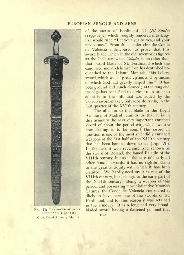 This refers to the so-called Lobera sword (formerly confused with the Colada of El Cid) and not the sword in the photograph. The latter is however also attributed to Fernando III (or his son).