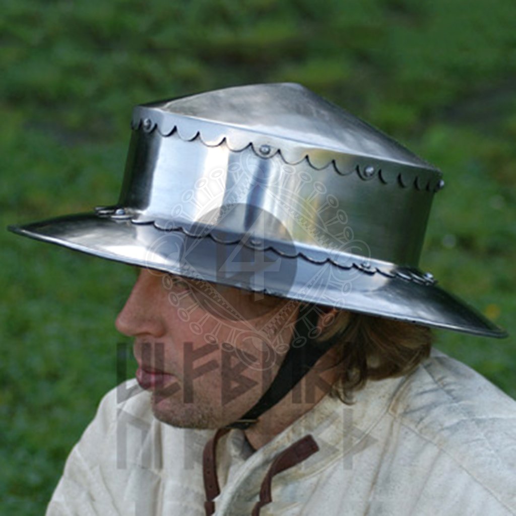 this kettle helm https://www.medieval-fightclub.com.au/armour/helms-and-helmets/middle-age-helmets/domed-kettle-hat-combat-ready.html
