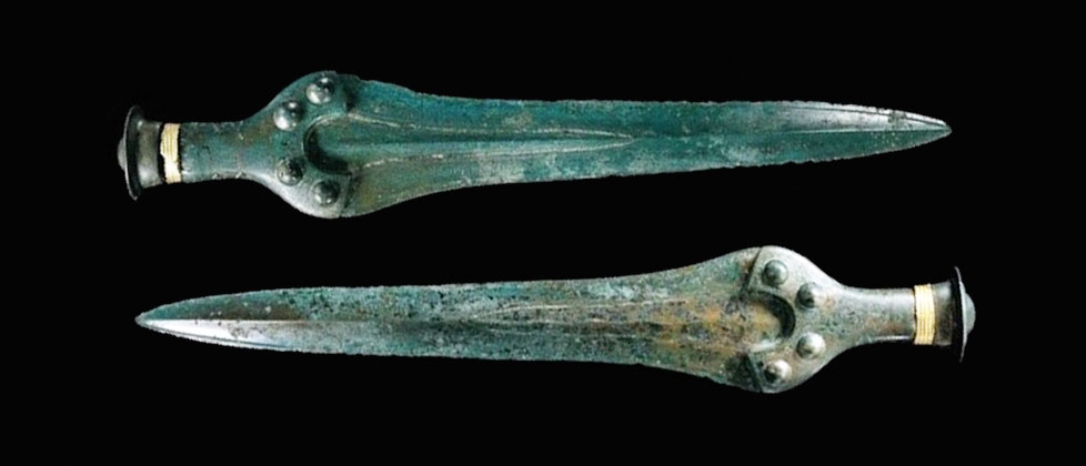 | Beide Schwerter sind sich äußerst ähn lich. Sie verfügen über eine ca. 36cm lange Klinge und nur eine Griffschale, die mit jeweils vier Nieten an der Klinge befestigt ist. |