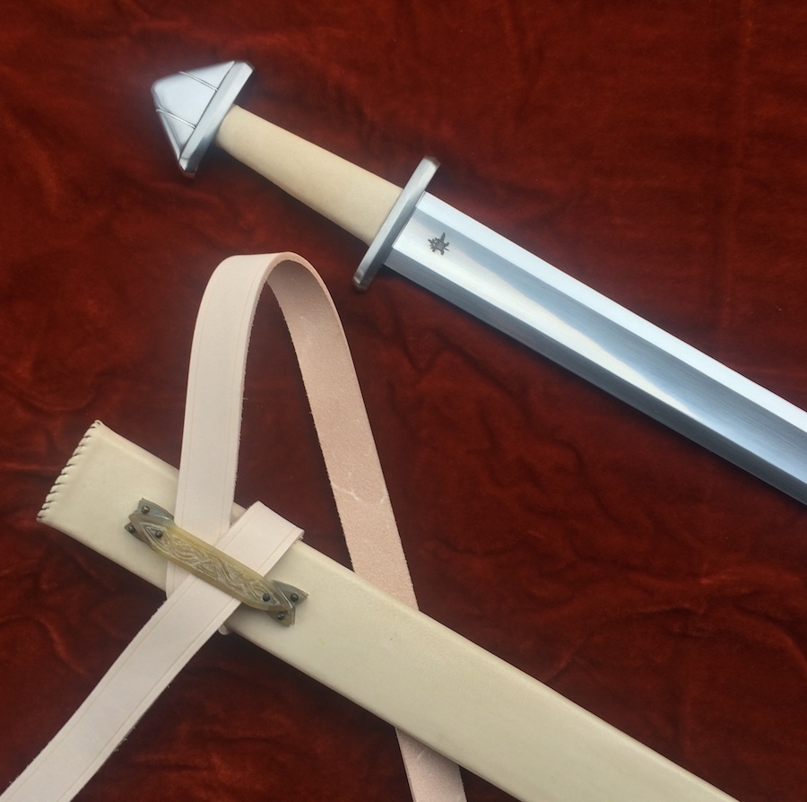 So, my Castle Keep custom Petersen type A late migration period.early viking age sword is finished and shipping out soon! The blade is EN45 steel. The guard and pommel are stainless,and the upper pommel has silver wire inlaying the grooves. The grip and scabbard are wood bound in natural vegetable tanned leather. The scabbard bar is carved horn. The metrics I gave him are 28" long blade that is 45mm wide at the base and tapers down to 40mm wide at the tip. The thickness is 4mm thick at the base and tapers down to 3mm at the end of the fuller, then tapers down to 2mm before the tip. The sword is not an exact duplicate of any one piece but instead is based on the small end of the historical metrics for Geibig type one blades, as Dr. Petersen was very vague about the blades on this type except that they were some of the smallest viking age swords.