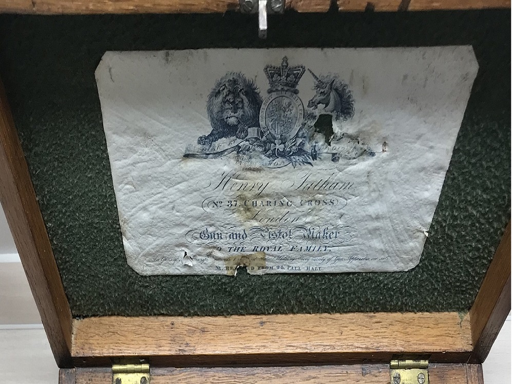 I am new in this Forum and a have a Question of a Cased English Pair (Percussion Pistols) mit Trad-Label in the case from Henry Tatham. The Case has inside green Velour with 2 Pistols/ 0ne Bulletzange/ one Powderflash and one Eley Perk. Caps and a Ramrod.