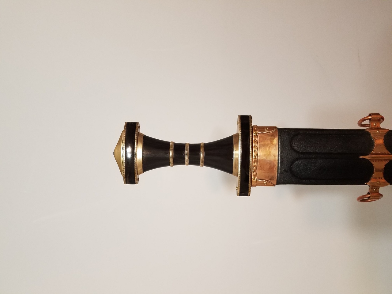 blade is O1 & L6 multibar, horn and bronze fittings, overall length 37 inches, 31 inch blade, 4 inch grip