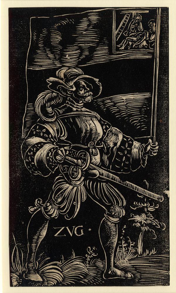 I think there are many parallel trends in Switzerland, Germany, Italy, and even Eastern Europe in this time period that make it difficult to truly isolate particular national characteristics. When Swiss and German soldiers start to become a popular artistic subject around 1490-1510, we can see a growing proliferation of S- and 8-shaped guards in the artwork, on short, proto-katzbalger weapons, but also on longer swords with typical pommels. Here are some of the latter as depicted by the German artist, Daniel Hopfer, circa 1510, carried by landsknechts and not Reisläufer (judging from the diagonal Imperial cross on one's halberd).