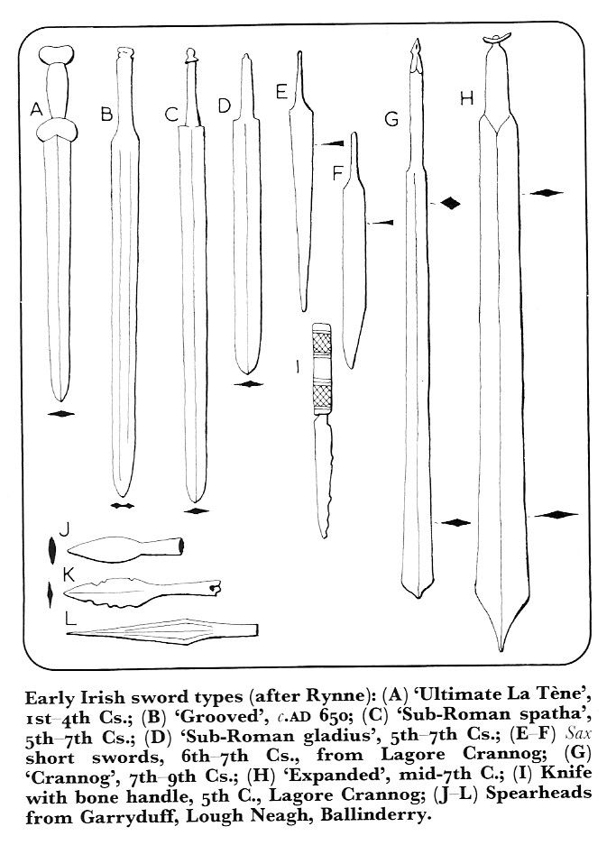 The classic treatment of late-Iron-Age and early-medieval Irish swords is the 1982 article "A Classification of Pre-Viking Irish Iron Swords" by Etienne Rynne. As far as I can tell, it's the first of only two important articles on the subject. It appears in an otherwise obscure Festschrift titled Studies on Early Ireland: Essays in Honour of M.V. Duignan, edited by B.G. Scott (Association of Young Irish Archaeologists: n.p. (perhaps Dublin or Queen's University, Belfast), n.d. (probably 1982). Pp. 93-97). Because the article is still protected by copyright, I'd ordinarily suggest that you try to get a copy through interlibrary loan, particularly if you have access to a university library or the research department of a large public library; but at the moment that may not be possible. So instead, if you'll PM me, I can help you find one.