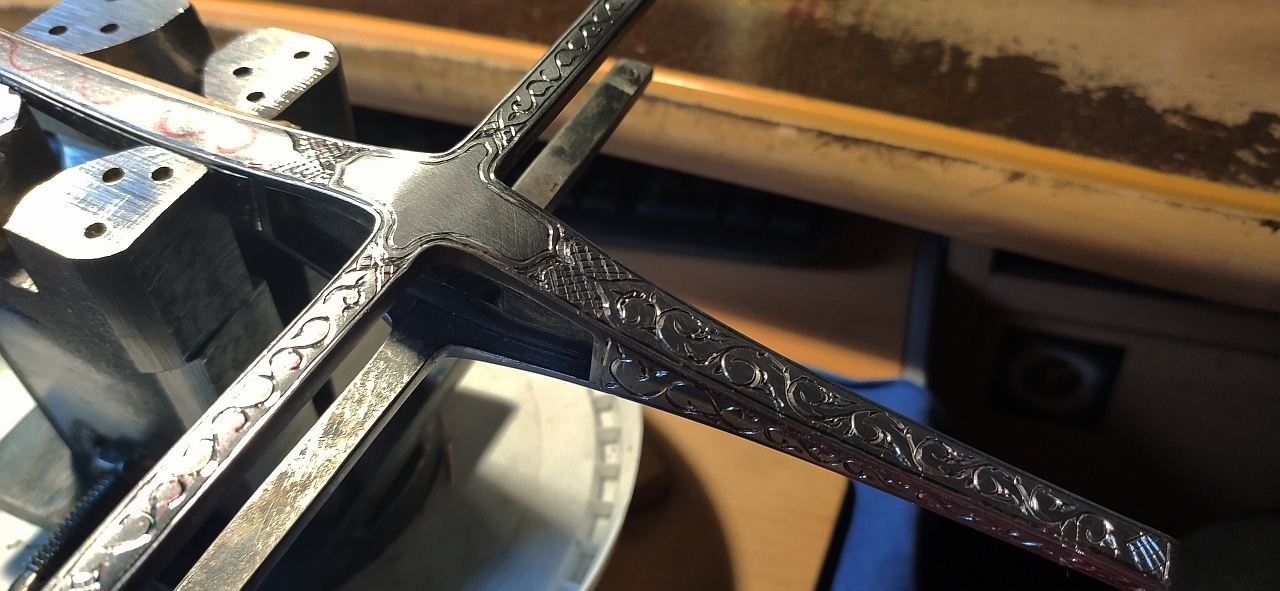 This method is a compilation of many. For the need to work faster, I had to make it up. First you have to engrave a pattern in steel, then another metal is applied by means of a flame punch. Traditionally, with such a large amount of pattern it would be very expensive.
