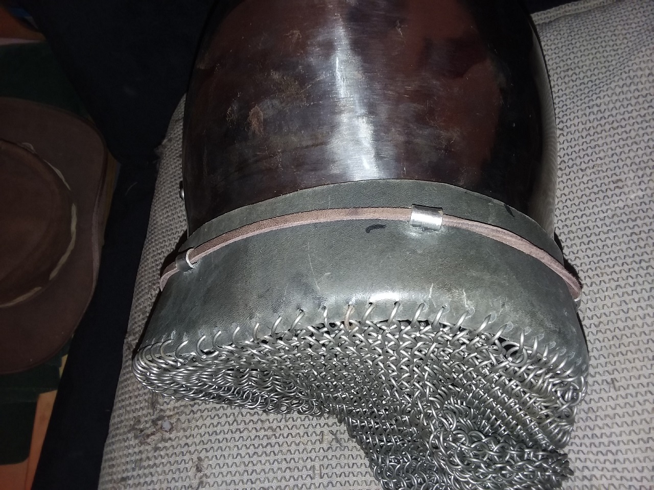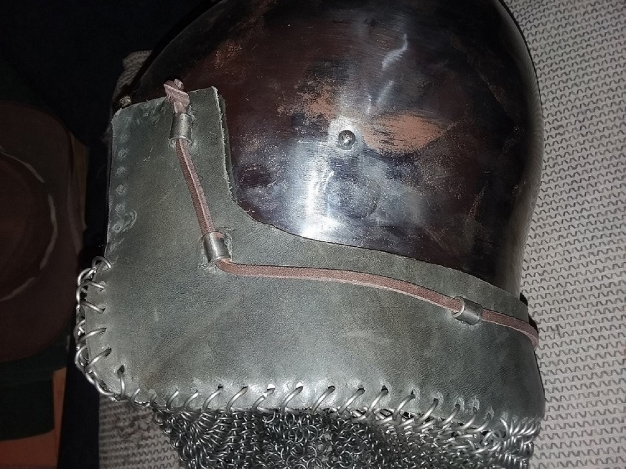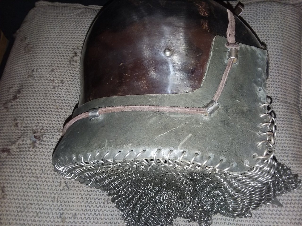 Here is a helmet I made many years ago, with the mail sewn to the leather strip, and the mail fully lined.