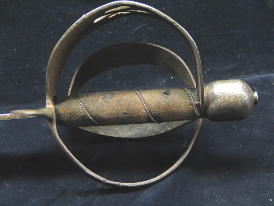 By "superficial," I mean that although the surface appears to be mottled, with some spots of active rust, there doesn't seem to be any rust damage to the surface--pitting, etc. Maybe it's there and the resolution of the images doesn't capture it. It seems unusual, too, that the upper end of the knucklebow would terminate in a ring and be secured beneath the pommel.