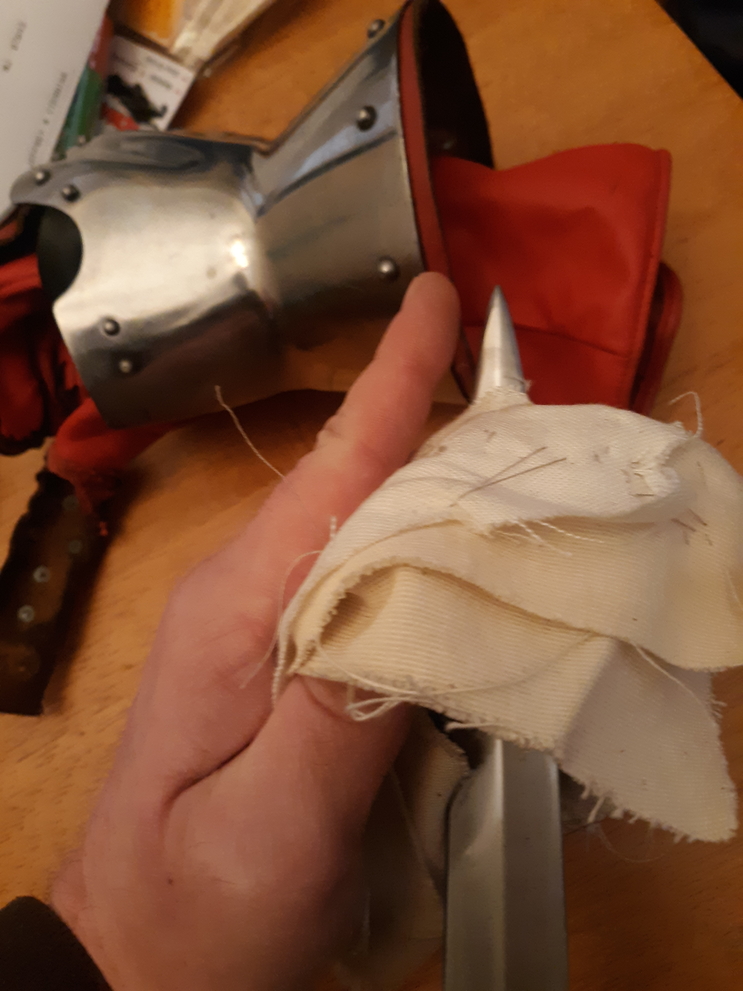 Were you fighting someone with a shirt, sleeves, or ventail that had been a bit abused? A section where the person setting rivets got a touch lazy? Maybe that's the luck you needed to get through. This is all completely speculative, of course, but it's fun to imagine. Mostly it was just to get the sensation of what it would take to -try- to get through it and injure someone beneath as I said. And that was certainly telling. My hand was sore the day after even though I was wearing a gauntlet. As was my shoulder a bit.