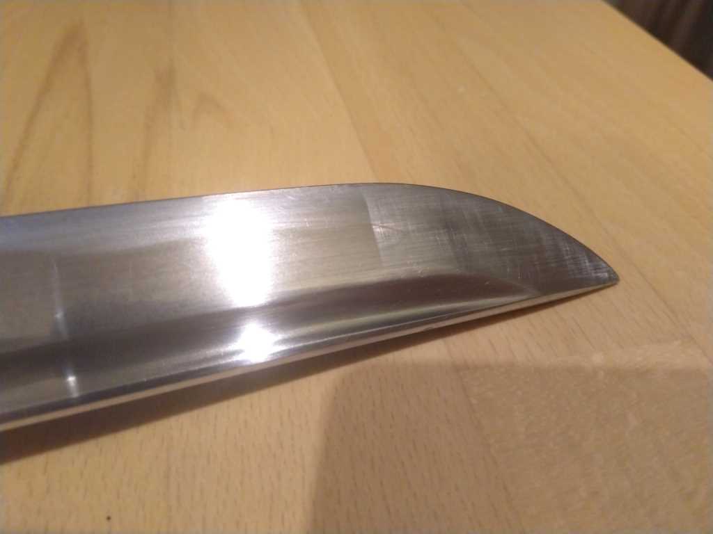 It came moderately sharp with a slight appleseed grind. It also has a fake hamon, which I have made a bit subtler. I have lightly touched up the edge with 2000 and 12000 grit belts, which is somewhat visible in the kissaki area but otherwise did not alter the geometry of the blade, despite making it very sharp.