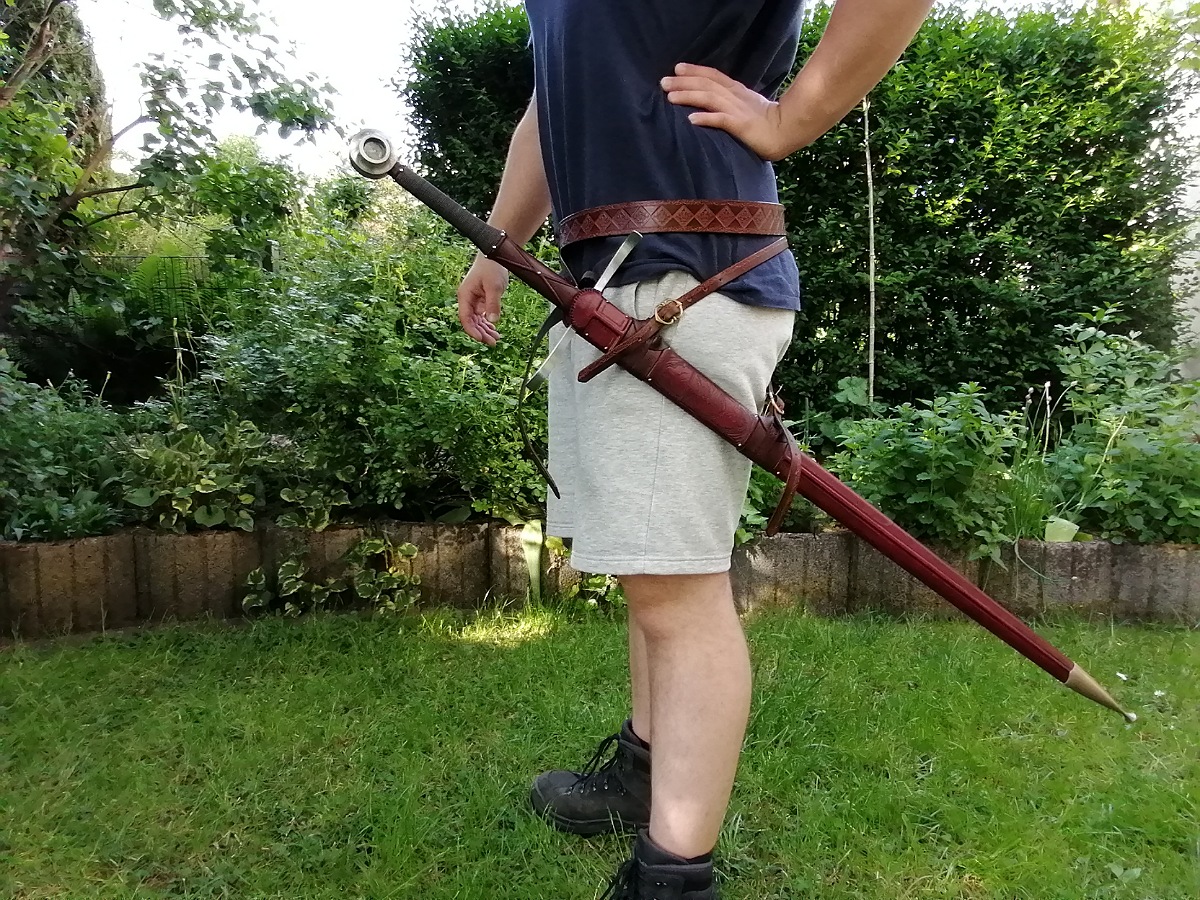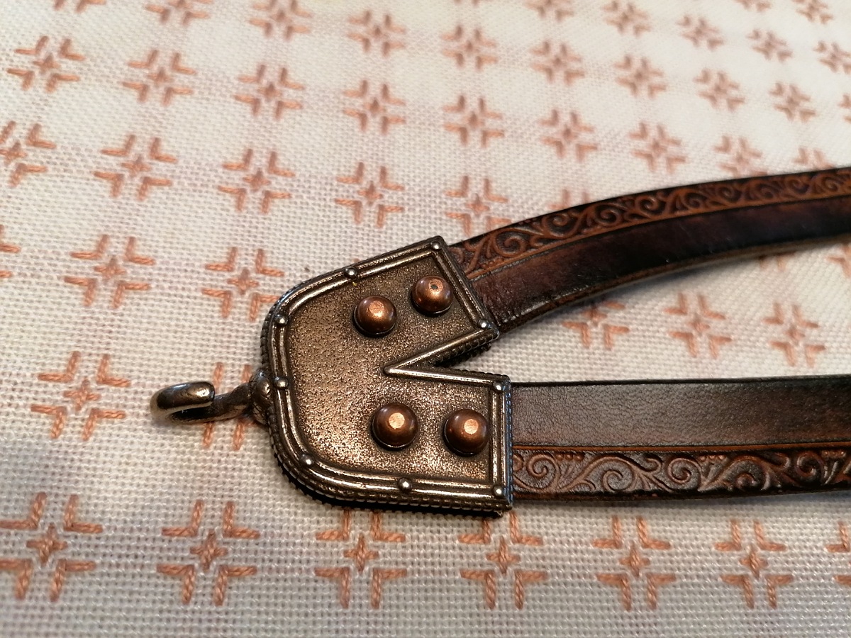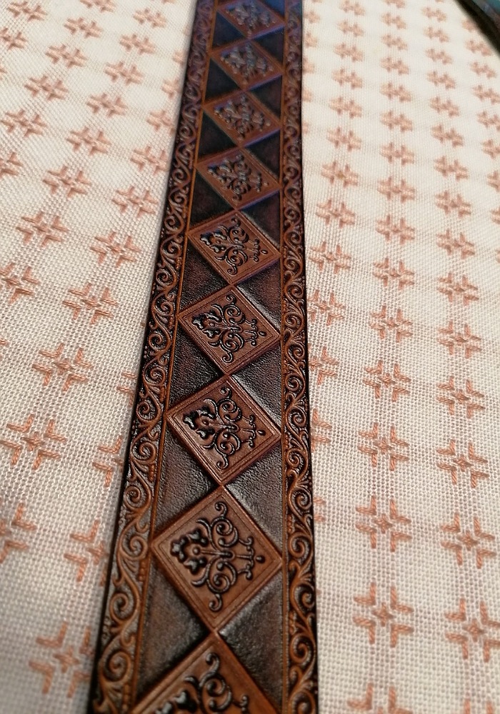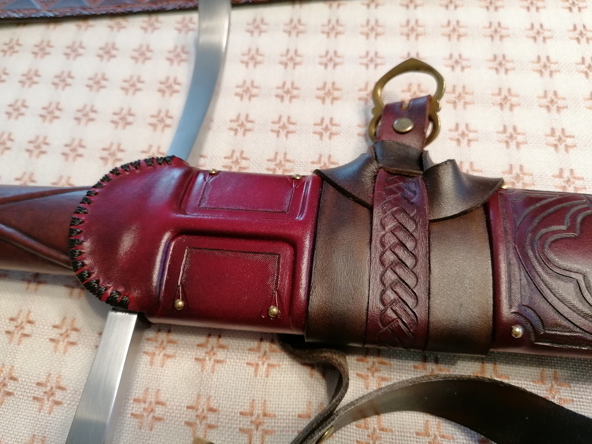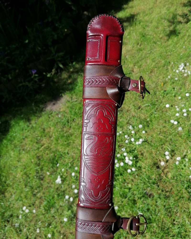 It has a central ridge running from the lowest belt all the way to the chape. Furthermore it features a leather carved image of a swan and highly detailed belts, which are embellished and decorated with very defined leather tooling.