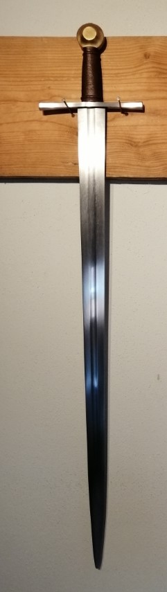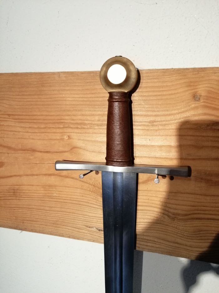 Classic one-handed sword with brass pommel, 13th century, inspired by original examples and historical sources. Dark brown grip color.