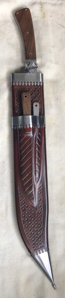 Scabbard has leather covered wood core and mild steel fittings. Back of the throat has a loop for a narrow belt.