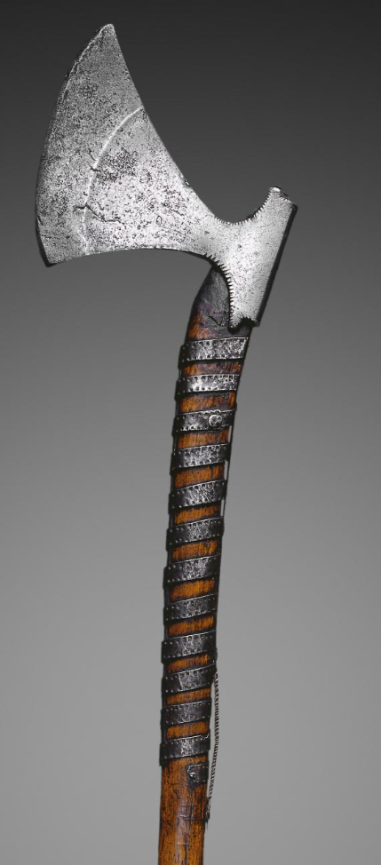 I am studying the two-handed clubs featured in the Morgan Bible, and I’m perplexed by the helical feature along the grip. It is present in each example, though there is slight variation (the same can be said of the nails/studs). Is this leather(thin?), paint, embedded metal bands, or something else entirely? Paint doesn’t seem likely to me, though I can’t say why other than I’ve just not seen record of it on anything but lances. Leather could help provide some grip, but could also prevent sliding the hands along the handle, though to be fair, I’m not sure how often this action would be taken with clubs. I’ve seen embedded metal bands in at least one manuscripts and an extant later period axe (that I kind seem to find the picture for) presumably as a way to strengthen or prevent damage to the haft. Perhaps it is none of these things?