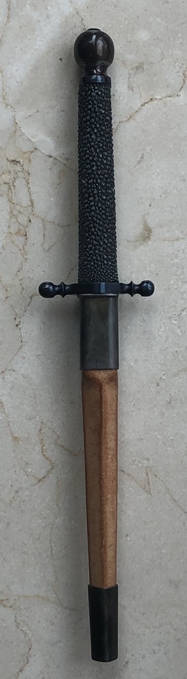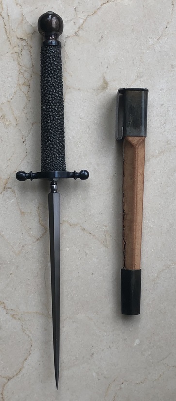 Blade is 5" long and square in cross section, 3/16" at the base, with a decorative ball section filed near the guard. I made it out of 1084, quenched in oil using my improved homemade can forge, and tempered to what should be around low 50s hardness, softer than normal knife blade to make it less brittle. It is really needle pointed!