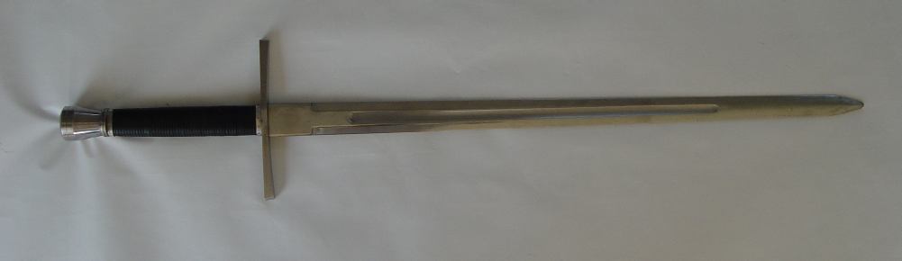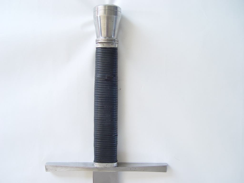 This sword has been used for some steel on steel combat, so it has some nicks on the blade. A solid and sturdy training weapon with a black leather cord wrap.