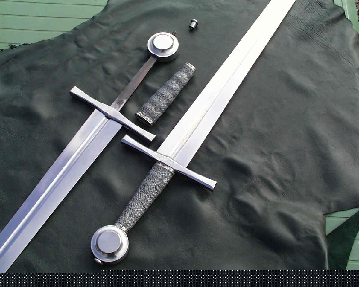 "OK,OK...so its time to get a new camera,this one has had its day i think,it has a hand cranked mechanism and a lareg black cloth over the back of it. anyway,this is to illustrate a new construction method that i shall be using from now on,the tang fits tight into the slotted pommel as in all Medieaval swords,but without being peened over at the top.The advantage of this method is two-fold,it allows the sword to be completely dissembled for cleaning etc,and a heated and peened tang on a modern tool steel blade will be brittle due to the heat used in the peening without the ability to anneal it afterwards.Some makers my weld a mild steel end onto the tang to overcome this but that is a further weakness in the construction,so i have provided a tang nut on top that can be undone and tightened up again after re-construction of the sword.I shall be using this in all future Knights swords and Claymores,which will add a little to the price,but worth it i think.. "