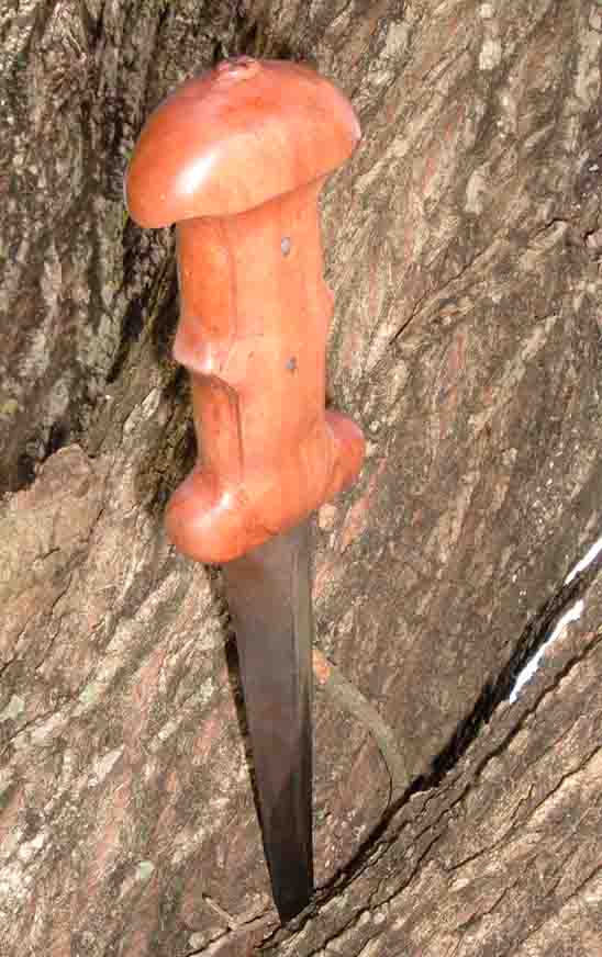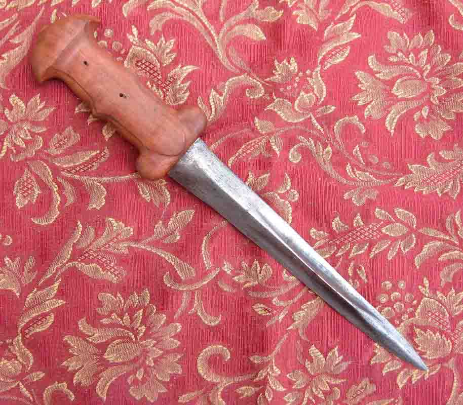 Hi......Our grand-foobah club leader has an original c.14thCent. dagger blade. He obtained it many years ago from a collector when he was in London. Having (almost) finished setting up my new workshop, he asked me to make a handle for it so we both set out checking our references. It was found in the Thames mud and is in excellent condition which always amazes me. It has a triangular blade with a partial fuller on the angular sides and is still sharp ! The original owner put it as mid 1300's to mid 1400's but it looks to me quite like some of the Mary Rose blades. My friend said he had seen two only like it in the Museum of London and the handles would certinally be of the suitable type. Unfortunately he only had taken Video footage of them which was as good as was possible at the time. While I was gazing at this image ( VHS ) still-framed on the screen at my friend's house, my girlfriend said.."why dont we try to take a still off the TV screen on my digital camera ?" Now, having been a commercial - advertising photographer and Audio-Visual producer for over twenty years, I did'nt know weather to laugh or cry at the suggestion ! But I've also learnt to give things a try....and guess what....it kinda worked ! So I zapped back home and started playing around with it on Photoshop. Photoshop has been a great tool for me for revealing and sharpening up details on paintings and drawings for my historical research. I've been able to find mistakes on suggested re-constructions and expose new fine details, etc. Anyway, this wasnt exactlly a period painting that I had to work with, but I was able to see lines and details well enough on a big monitor to do a reasonable job of reproducing what was the only reference available to me. The little carved button at the top was decorative only, but was on the originals. When I was making this I felt that the grip was on the small size for the blade and my friend thought the same when he first saw it and then he held it....when you hold it it fits into the hand so well....both under and over grip. It's sort of a hybred handle .....the top is a bit Swiss Basilard-like and the bottom......well, it kinda wanted to be a "Ballock" but it stopped growing in it's early teens ! The original had what looked to me like a wooden cover plate on the grip as the top of the tang flairs out wide.........finally I put the two rivets through the original holes. Wish I could have kept it !!