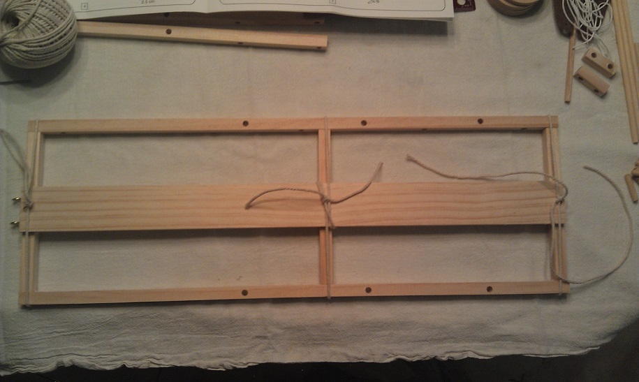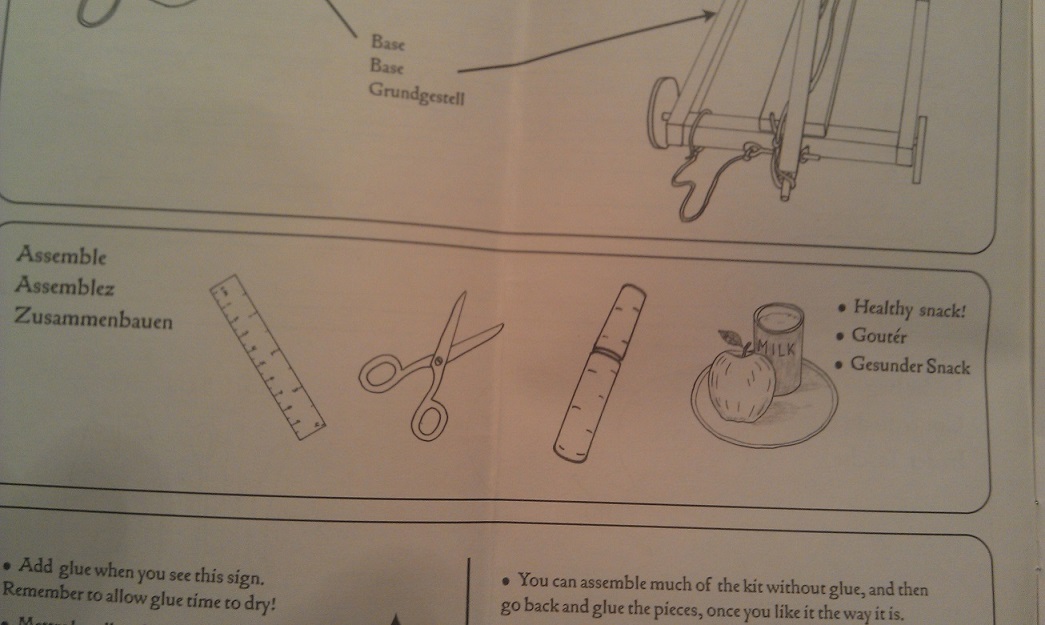Dowel holes are over-bored just slightly, so assembly is easy, but taking the time to let glue cure essential on a couple of steps. The instructions (included shot of the amusing "items needed" section, where it suggests a "healthy snack" ) suggest building most of the superstructure, but I paused after doing the base and binding it together with butchers twine (couldn't find any decent rubberbands around). Have pics of some of the interim steps, including the cut dowels - the kit gives you enough to screw a couple up and still make it work - and the base. A couple of "beauty shots", including one that shows my Albion Munich alongside for some scale.