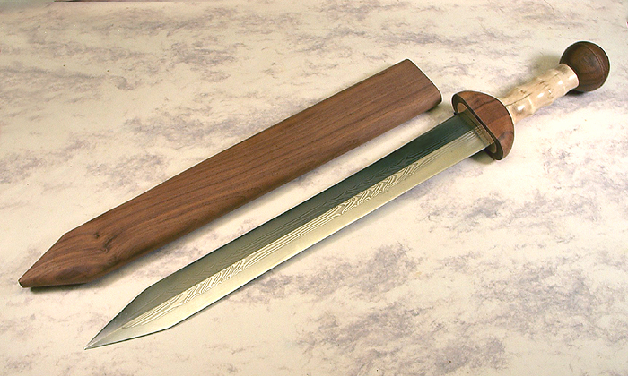 | Vermont smith J. Loose has a new pattern-welded gladius on his website, soon to be available. The blade is apparently an ironic (?) commemoration of the Battle of Teutoburger Wald (the scabbard has yet to be finished, but will feature scenes from that battle) and really looks to be something special. J. Loose has previously produced some beautiful seax blades (also viewable on his site), but I believe this to be the first time he's tackled a sword of this type.