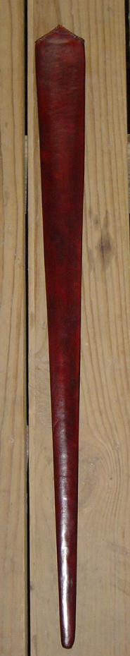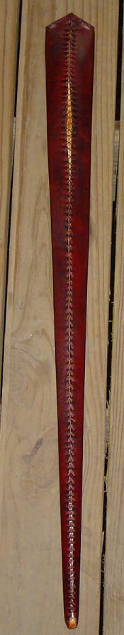 I only have four complaints with the scabbard as a whole. 1, the core does not match the sword's cross section as closely as I would like. As mentioned before, this was an unfortunately necessity in some ways. 2, the gap where I trimmed off too much leather irritates me, especially since I had more than enough to start with. 3, I did not think about compressing the leather like I should have, and I didn't really have any tools for that on hand. I managed to do well enough with a metal paint can opener. The front looks fine, but the back could have used a little more attention. Even then, it is not really visible, it's just something I know about. And 4, while stitching the triangular flap at the throat of the scabbard, I pricked my finger, and got a small line of blood on the front of the scabbard. I'm sure the leather dye will hide that well enough, but I still would have prefered it not happen.