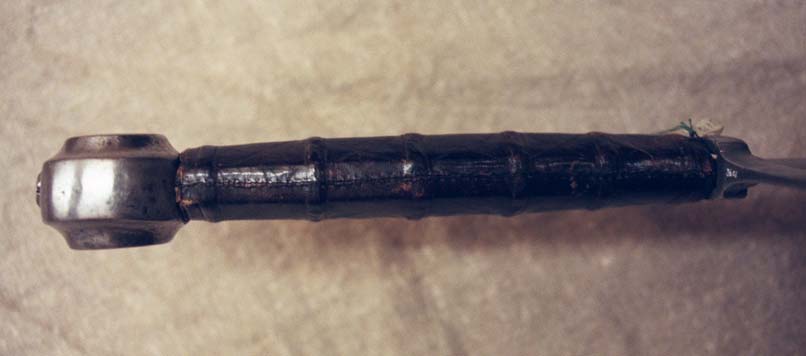 | All of the swords that I saw in Germany that still had leather grips on them were glued only. There is one eception to that, where a small executioner's style sword had stitching on the grip. In every case the seam was visible, but the leather appeared very thin. Probably no more than 1 oz and possibly lighter. Grip colors included black, dark red, several shades of brown, and one white grip (it was real bumpy and may have been some kind of ray skin or something).