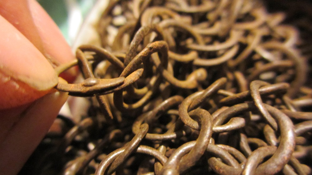 Both pieces are of non-European mail. The thicker riveted links are quite worn, but they are in good enough condition to identify them as belonging to a group having a lapped area with a point that faces the inside of the link.