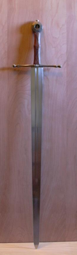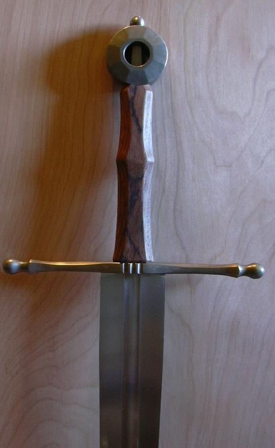 Due to some unforseen expenses I have decided to let one of my swords go. This sword is based on an ATrim 1314/1321 blade with fittings made by myself. The fittings are steel, lightly etched. Grip is cocobolo.The hilt is dismountable by means of a spherical nut, thread is 1/4-20. The edges have been blunted very lightly for handling purposes and can be brought back to the original edge very easily. This sword feels very nice in the hand, a powerful but manageable cutter. This is essentially a one hand sword with just enough weight and grip to make occasional two handed cuts effective.