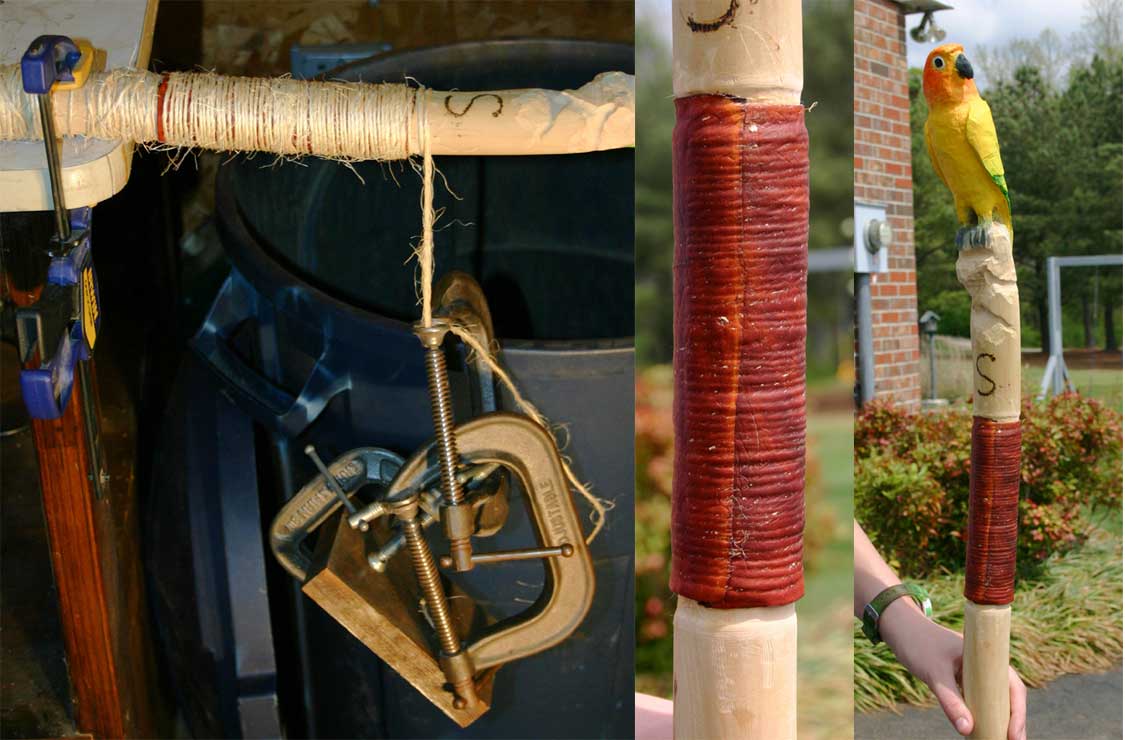 For cord I am just using Sisal hemp bailing cord as this is a trial attempt. The hardware store variety is pretty rough (diameter varies a lot and it needs a hair cut to trim loose fibers after wrapping it.) I lightly brushed wood glue over the sisal cord on the wood before applying the leather over it.