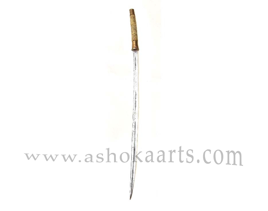 "An interesting old Burmese sword 'Dha'. Simple fighting sword of good quality construction, tubular hilt with grip covered with white rayskin and ornamented with inset brass pins in patterns, brass top and bottom mounts. Long slightly curved steel blade of well forged light steel, thickened back leading to a sharpened or thinned back edge halfway down. Unusual series of central fullers interrupted by panels of inlaid brass detail, including a short inscription in Burmese script, two panels including numbers probably dates, and an attractive image of a fish. Burma, early/mid 19th century."
