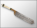 The Victoria and Albert Museum in London. It has an ivory grip decorated with incised and filled floral patterns (like scrimshaw), surrounded by spacers of brass, ebony, and green-dyed ivory. A silver knob completes it. The blade, with an integral bolster, is acid-etched with floral designs and a woman's face in addition to the musical notation and text and is partially gilt.