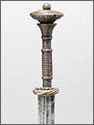 Hermann Historica auction house has many features described above. It has a complex double-edged blade with four fullers and a guard comprised of short brass quillons with a side ring. The grip is turned fruitwood covered in leather and brass bands.