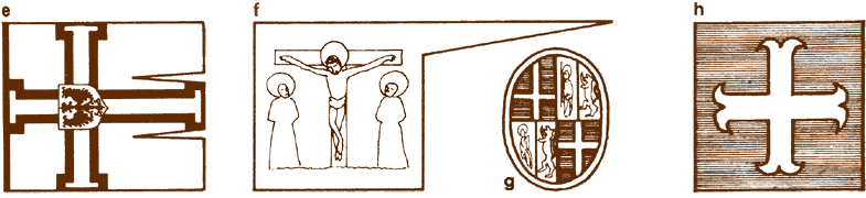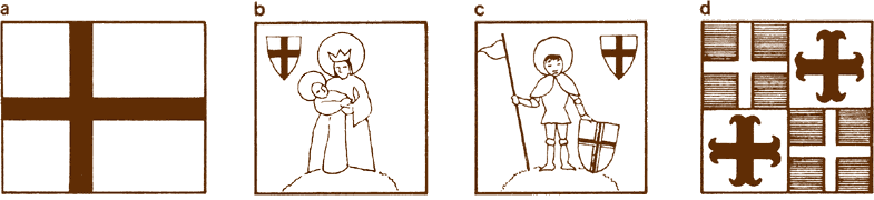 a. Lesser banner of the Grand Master of the Teutonic Order, captured at Tannenburg. Black cross, white ground, b. and c. Two sides of the Great banner of the Livonian Master, early 15th Century. Virgin's robes blue and white, face etc natural colors, grass green, halo gold. St. Maurice has gray armour, gold elbow and knee plates, with white halo, robe, shield and flag. Background (both sides) white, d. Late 15th Century Knights of St. John flag. Top left and bottom right red with white crosses, other quarters gold with red crosses, e. Great banner of the Grand Master of the Teutonic Order. White with gold cross and shield, black borders and double-headed eagle, f. Late 15th Century Knights of St. John flag, g. Shield of the Grand Master of the Knights of St. John, 1564. h. Flag of the Knights of St. John, 1535. Red with white cross.