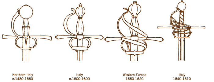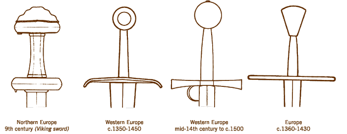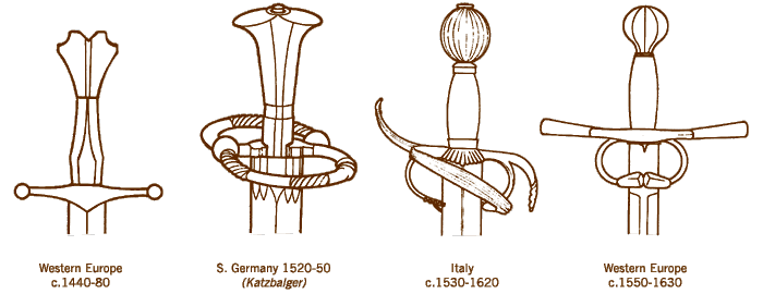 The earliest blades, cast or forged in bronze and iron, were made for fighting techniques based entirely on the thrust; in this period the hilt was no more than embryonic. Before long, and not least because of great progress in metallurgy and constructional techniques, swords were designed for delivering cutting blows, and it was soon clearly necessary to extend the quillons, or cross guard, to ward off blows from the enemy's blade. During the Middle Ages the quillons became gradually longer, and the whole format of the sword was modified; it now sported a fairly broad blade, grooved at the center and often rounded at the tip. Throughout the 14th century the various modifications only applied to the length of the quillons; these varied from country to country as a result of local preferences, but they invariably remained perpendicular to the blade, were fairly round or four-sided in section, and often flattened out at the ends. They were frequently curved toward the blade, but sometimes toward the handle, although this was rare, being quite unsuitable for the hand when a wide motion was required to deliver a powerful cutting blow. After the 15th century the hilt became progressively smaller in size, not less because of the wide use of new protective elements; the arms of the hilt and various additional parts (loops, rings, bars, and so on).