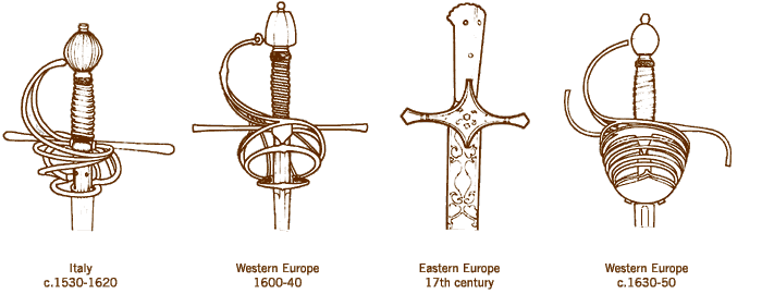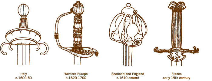With the 17th century the quillons once more became straight, owing to new fencing techniques that introduced various thrusting blows. The sword itself had been considerably modified, its blade having become narrow and long, with a fairly flattish rhomboid section, often grooved, at least in the rear section (forte). The quillons of the Spanish-type sword protruded far from the shell guard or cup guard, and were very efficient at parrying. In the smallsword and dress sword, the quillons were short and lobed at the tips, and barely protruded from the shell guard.