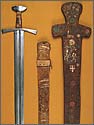 The pommel is a flattened version of a Brazil nut form known as the Oakeshott Type A. The fuller of the blade is engraved with H+H on one side and +H+ on the other. It is believed this is a reference to the holy trinity. The Style 6 guard is of a curved form.