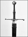 One such modern-made example of these fully-developed forms is the Arms & Armor German Bastard Sword. It's an attractive sword with fantastic dynamics that is based on a particular extant antique with horizontally recurved writhen quillons and compressed button terminals with spirally-fluted detailing. Two oval-shaped side rings serve as hand protection and are decorated with deep diagonally-hatched lines. The large turban-shaped pommel is comprised of bands of bare and crosshatched sections.