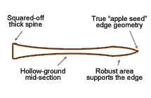 The spine is very stout and leads into a deeply hollow-ground center area that then blends into a robust swelling that supports the edge. The actual edge is a true "apple seed" section without a secondary bevel and is very sharp.