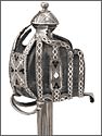 The basket is extensively adorned with silver inlaid designs of various forms of lines and ovals. The steel has been lightly blued to provide contrast with the silver. Each shield is decorated with a central circular hole surrounded by pierced hearts and four daggers in saltire.