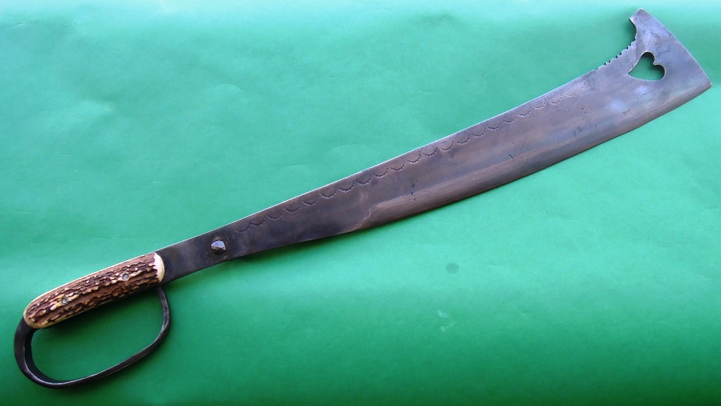 We can see very clearly that, except for the shape of the tip which ressembles the Invalides falchion, it is obviously the same construction with the "gancio" forming a branch guard, and the two scales protruding past the tang, in a very classical fashion on Italian roncole. But it is a relatively immediate descendant of this kind of thing:
