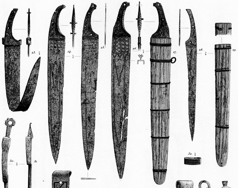 FYI, in Klaus Randsborg's "Hjortspring - Warfare and Sacrifice in Early Europe" he states that, "11 single-edge swords (8 of which are complete) were found (c. f. Fig. 7). The length of the blade varies between 28 and 57 cm. One specimen is a scimitar with inwardly curved edge. Some four wooden scabbards are more or less preserved."
