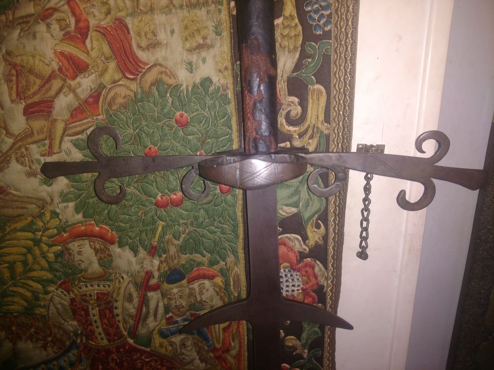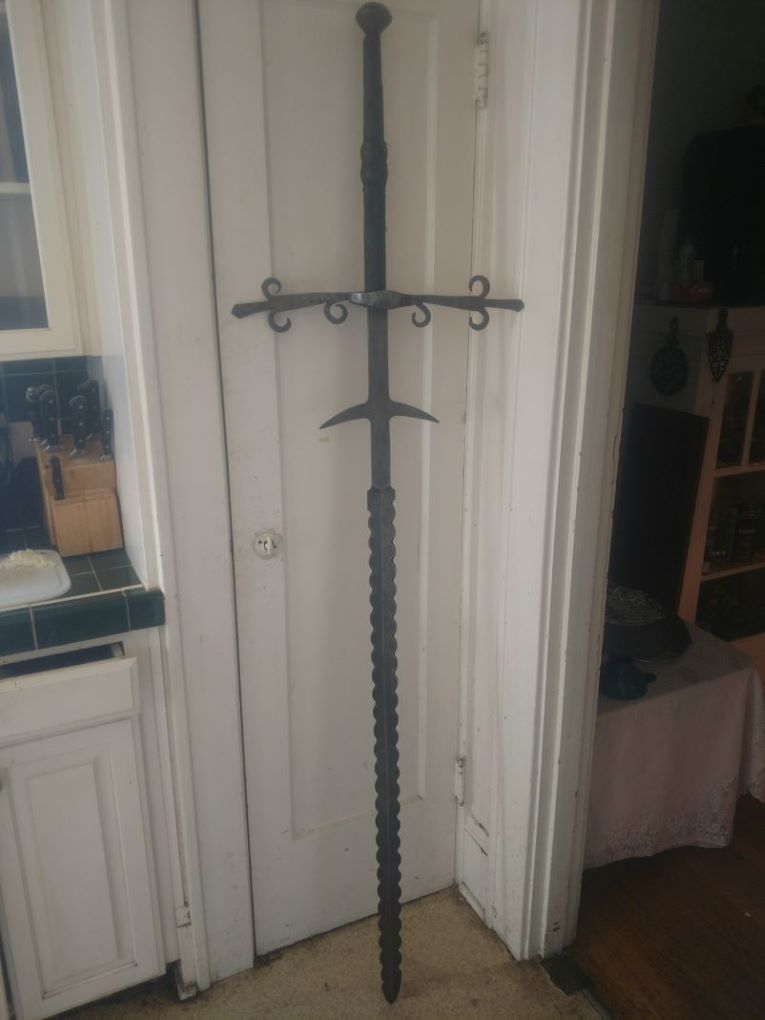 Picked up this little guy as an investment during lockdown. It looks like an original to me. Patina is right and age on the wood and leather on the handle is about what you'd expect. Blade is quite edgy and even though it stands about 6' 2", the weight is right for a fighting sword at about 9 pounds. A not uncommon hilt style, you can see a famous similar sword located at the Cleveland art museum https://www.clevelandart.org/art/1919.71