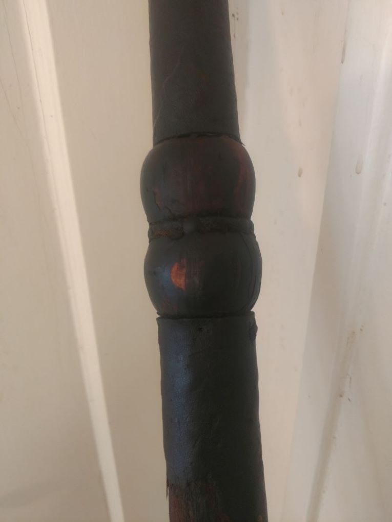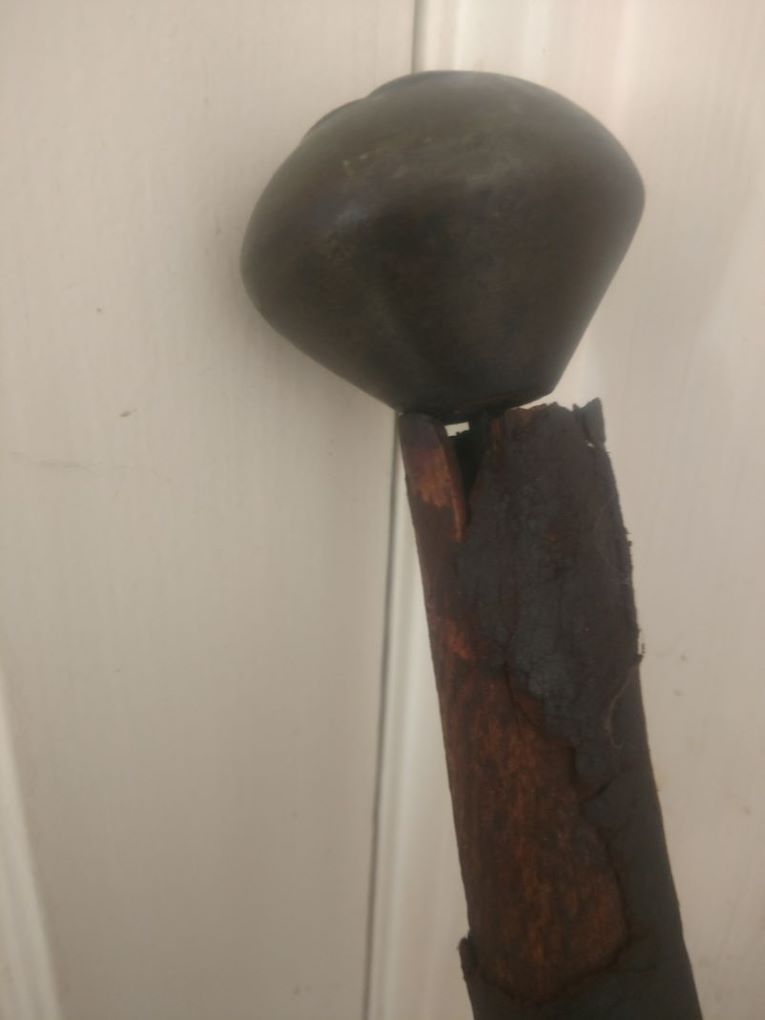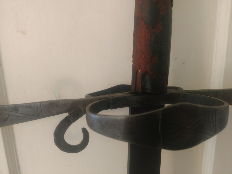 I would like to sell this, but the handle has extensive damage. It's loose and moves about hence the guard is loose as well. The leather that is left is falling apart. I'm debating having a new handle constructed. Problem is the pommel would have to be removed and be repeened. Or maybe I should sell as is. I'm trying to get the best price I can so I can escape Portland and relocate to a better place. Be happy for any input and suggestions.